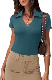 🎉 Score big with 50% off plus an extra 10% off with a clip on v-neck ribbed short sleeve top with collar! Available in sizes S-XL, this chic top is a wardrobe essential.✨👚 #linkinbio ad